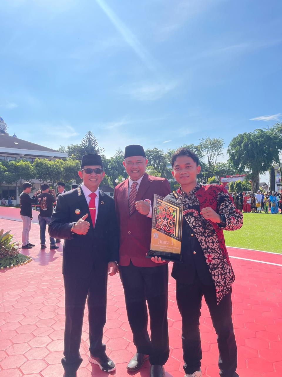 Kiri Wali Kota Balikpapan Rahmad Mas’ud, Rektor Universitas Mulia Prof. Dr. Ir. H. Muhammad Ahsin Rifa’i, M.Si., dan Agung perwakilan mahasiswa Universitas Mulia berfoto bersama usai upacara peringatan Hari Sumpah Pemuda di Balai Kota Balikpapan.