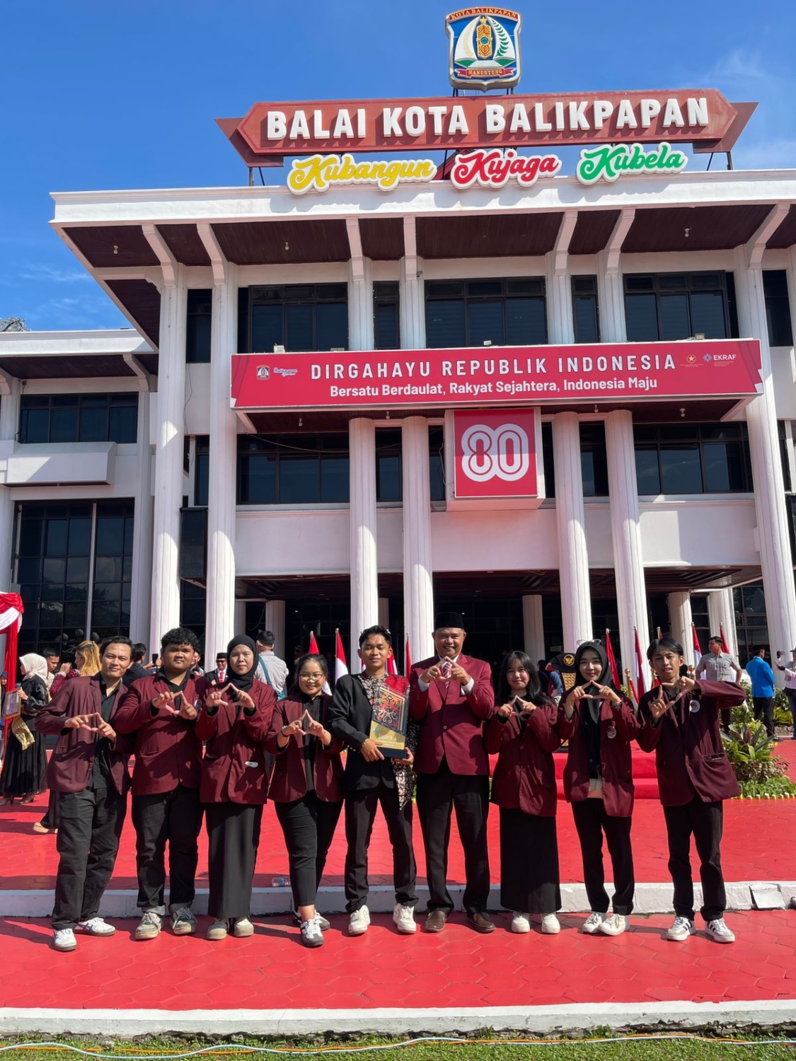Prof. Ahsin dan Mahasiswa Universitas Mulia berfoto di halaman Balai Kota Balikpapan usai mengikuti upacara peringatan Hari Sumpah Pemuda.