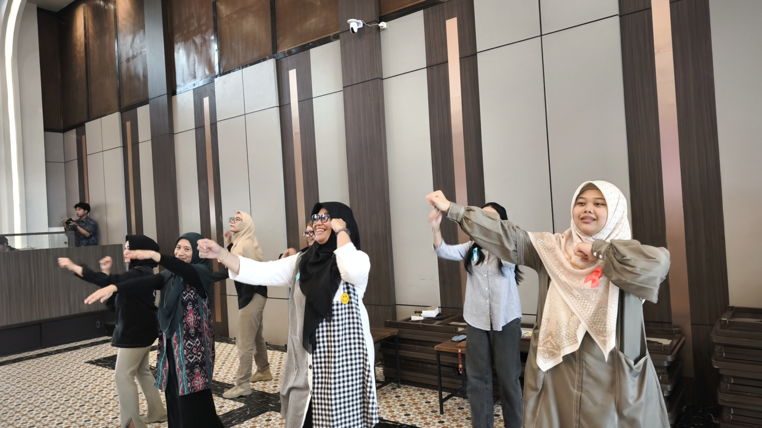 Dosen Program Studi Farmasi Universitas Mulia bersama Kaprodi Apt. Warrantia Citta Citti Putri, S.Farm., M.Sc., mengajak peserta melakukan sesi ice breaking melalui senam poco-poco di sela kegiatan kuliah umum, menciptakan suasana interaktif dan menyegarkan di tengah kegiatan akademik.