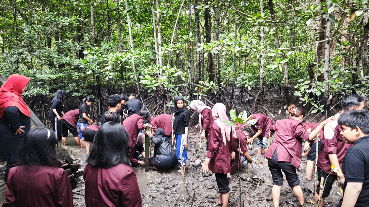 Mahasiswa Universitas Mulia menanam bibit mangrove di area berlumpur Margomulyo. Meski becek dan licin, mereka tetap antusias berkontribusi menjaga ekosistem pesisir.