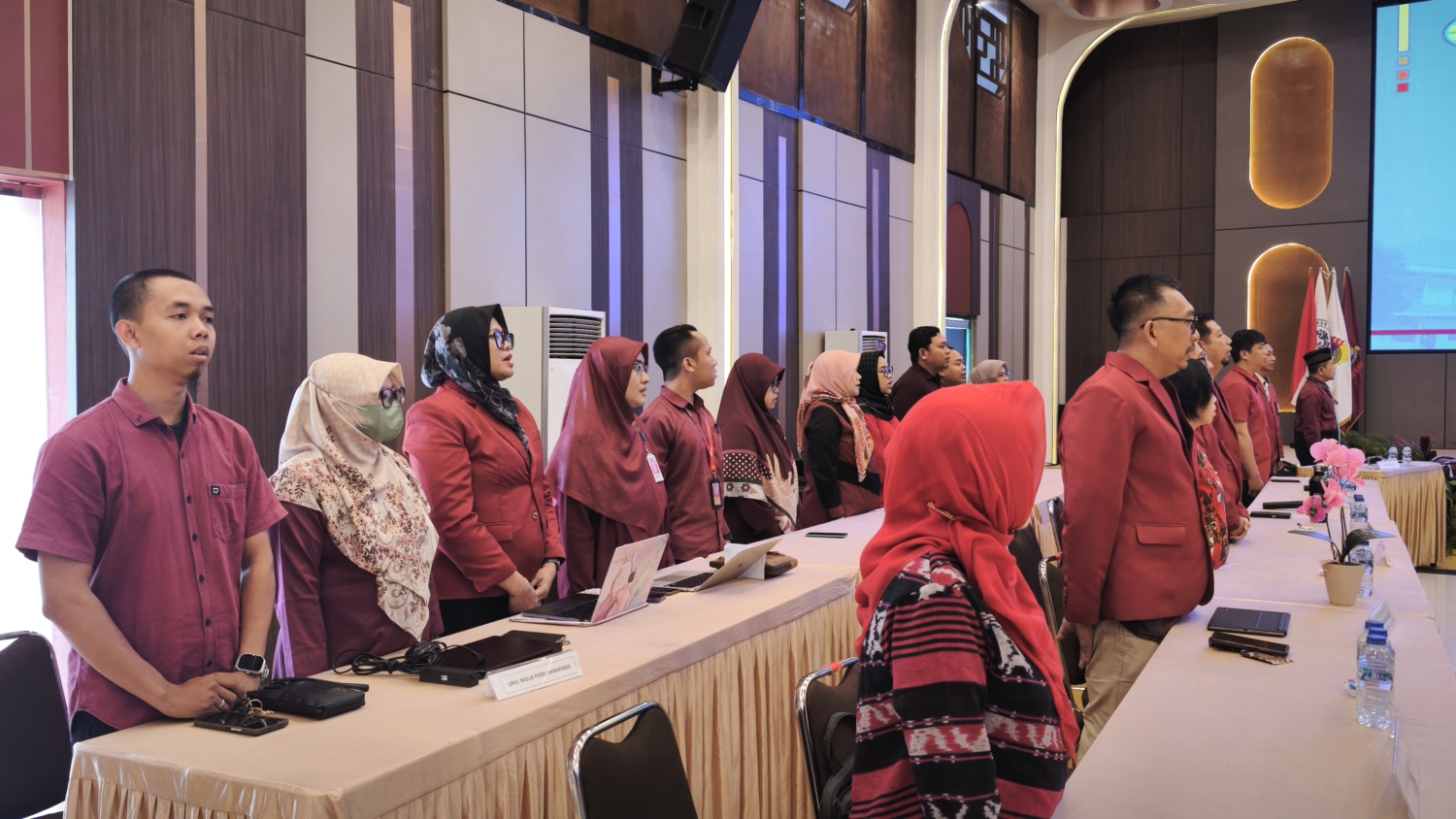Para dekan dan kaprodi Universitas Mulia berdiri menyanyikan Mars UM pada pembukaan Asesmen Lapangan BAN-PT, Jumat 21 November 2025, bertempat di Ballroom Cheng Hoo.