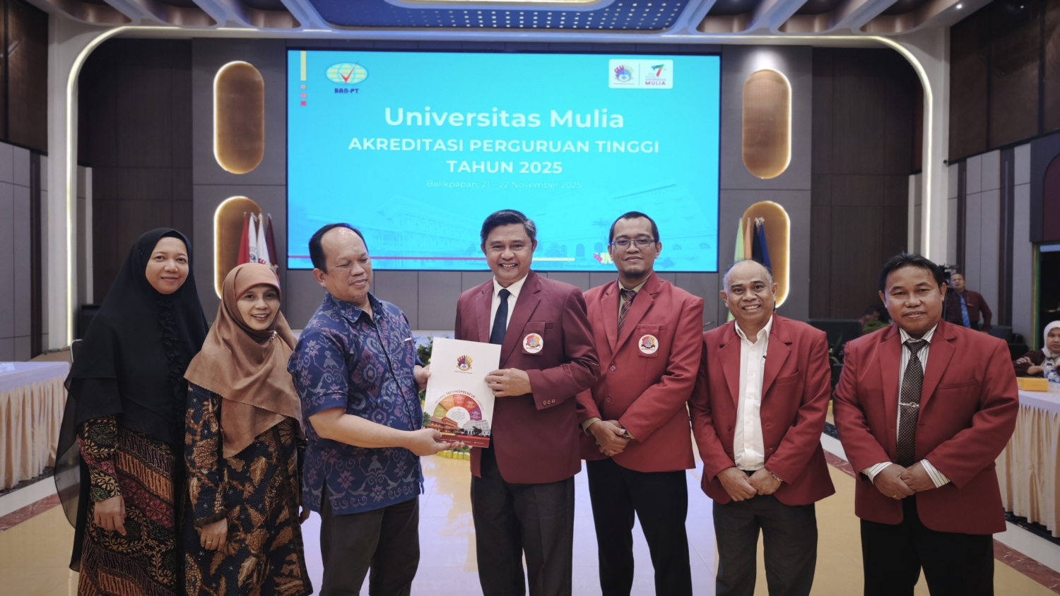 Rektor Universitas Mulia, Prof. Dr. Ir. H. Muhammad Ahsin Rifa’i, M.Si., menyerahkan dokumen kepada tim asesor BAN-PT: Prof. Dr. Ir. Ansar Suyuti, M.T. (Universitas Hasanuddin), Prof. Dr. Pupung Purnamasari, S.E., M.Si., Ak., CA. (Universitas Islam Bandung), dan Dr. Aan Listiana, S.Pd., M.Pd. (Universitas Pendidikan Indonesia). Prosesi berlangsung dengan didampingi Wakil Rektor Bidang Akademik Wisnu Hera Pamungkas, S.T.P., M.Eng.; Wakil Rektor Bidang Sumber Daya Yusuf Wibisono, S.E., M.T.I.; dan Wakil Rektor Bidang Kemahasiswaan Sumardi, S.Kom., M.Kom.