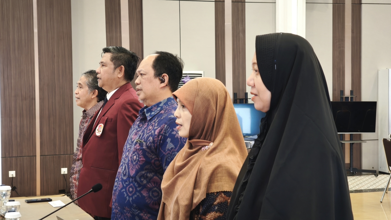 Tampak dari sebelah kiri: Direktur Eksekutif BPH Yayasan Airlangga, Dr. Agung sakti Pribadi, S.H., M.H.; Rektor Universitas Mulia, Prof. Dr. Ir. Muhammad Ahsin Rifai, M.Si.; serta para asesor BAN-PT — Prof. Dr. Ir. Ansar Suyuti, M.T. (Universitas Hasanuddin), Prof. Dr. Pupung Purnamasari, S.E., M.Si., Ak., CA. (Universitas Islam Bandung), dan Dr. Aan Listiana, S.Pd., M.Pd. (Universitas Pendidikan Indonesia) — berdiri tegap menyanyikan lagu kebangsaan Indonesia pada pembukaan asesmen lapangan Akreditasi Institusi Universitas Mulia.