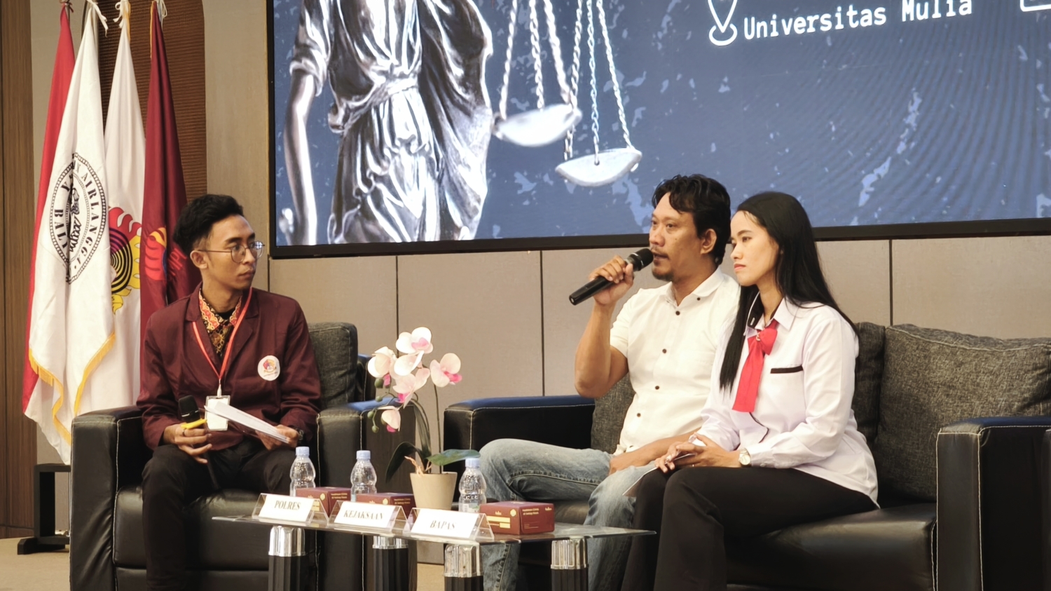 Moderator Iqbal, mahasiswa Prodi Hukum Universitas Mulia tingkat 1, memandu jalannya seminar; Bripka Suarsono, S.H., dan Brikpol Sefti Untari dari Unit Pelayanan Perempuan dan Anak (PPA) Polresta Balikpapan menjawab pertanyaan peserta pada sesi pertama.