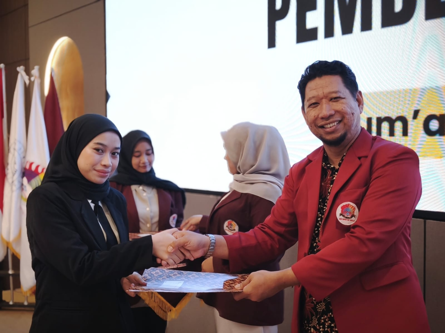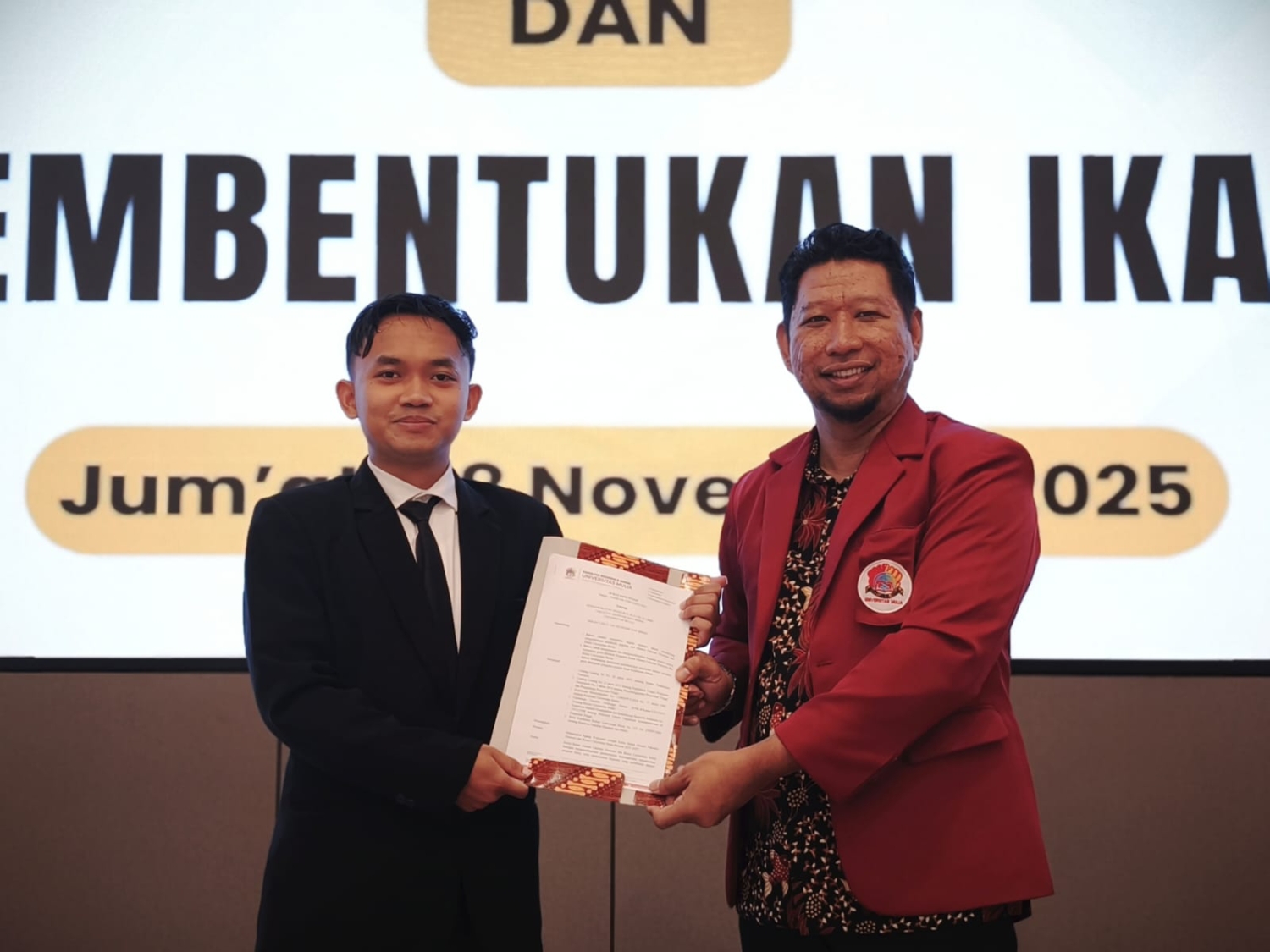 Dekan FEB, Dr. Ivan Armawan, S.E., M.M., menyerahkan Surat Keputusan kepada Ketua IKA FEB terpilih, Agung Widiyanto, S.M., sebagai tanda resmi terbentuknya IKA FEB periode 2025–2027.