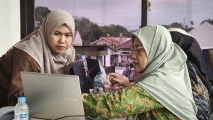 Sekretaris LPPM Universitas Mulia, Henny Okta Piyani, S.E., M.Ak., berdiskusi dengan beberapa dosen terkait penyempurnaan substansi dan kelengkapan teknis proposal BIMA 2026.