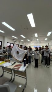 Pengibaran bendera pataka Program Studi Manajemen Universitas Mulia sebagai penanda pengukuhan kepengurusan Himpunan Mahasiswa Manajemen periode baru.
