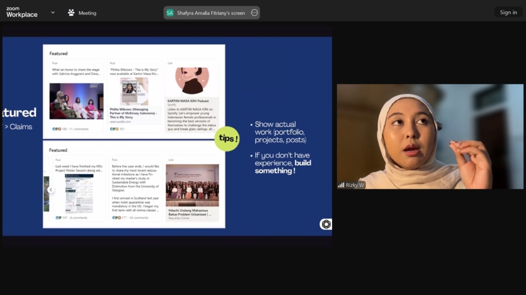 Dalam pemaparannya, Rizky Wijayanti menekankan bahwa LinkedIn bukan hanya platform formalitas pencari kerja, melainkan ruang personal branding yang dapat merepresentasikan kapasitas, pengalaman, dan arah karier seseorang. Mahasiswa diperkenalkan pada pentingnya menyusun profil yang kuat melalui headline yang tepat, deskripsi diri yang terarah, hingga penyajian pengalaman akademik maupun organisasi secara profesional.