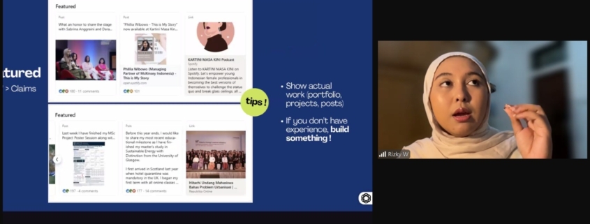 Kuliah tamu semakin menarik saat memasuki sesi quick review, di mana nara sumber meninjau secara langsung beberapa profil LinkedIn mahasiswa. Melalui evaluasi tersebut, mahasiswa dapat melihat secara nyata bagaimana detail kecil seperti foto profil, narasi personal, maupun struktur informasi dapat memengaruhi kesan profesional di mata publik.