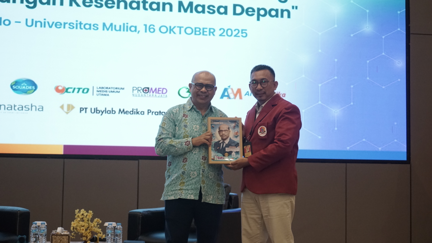 Penyerahan cendera mata kepada narasumber Prof. apt. Muchtaridi, Ph.D. sebagai bentuk apresiasi atas penyampaian materi dalam Seminar Farmasi Nasional (SAFANA) 2025 di Universitas Mulia.