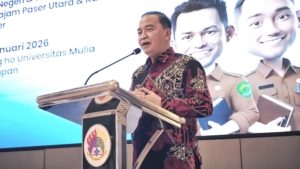Direktur Eksekutif BPH Yayasan Airlangga, Dr. Agung Sakti Pribadi, S.H., M.H., menyampaikan sambutan dengan mengenakan kopiah ulat doyo khas Kutai sebagai penanda identitas lokal.