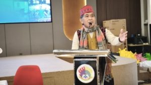 Direktur Eksekutif BPH Yayasan Airlangga, Dr. Agung Sakti Pribadi, S.H., M.H., menyampaikan sambutan dengan mengenakan kopiah ulat doyo khas Kutai sebagai penanda identitas lokal.